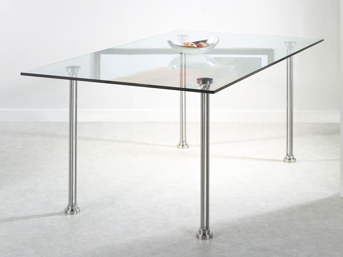 The sheer simplicity of the Novello Dining Table encourages an air of minimalist tranquility in the dining room. Stanchions of stainless steel effortlessly uphold the glass table top.