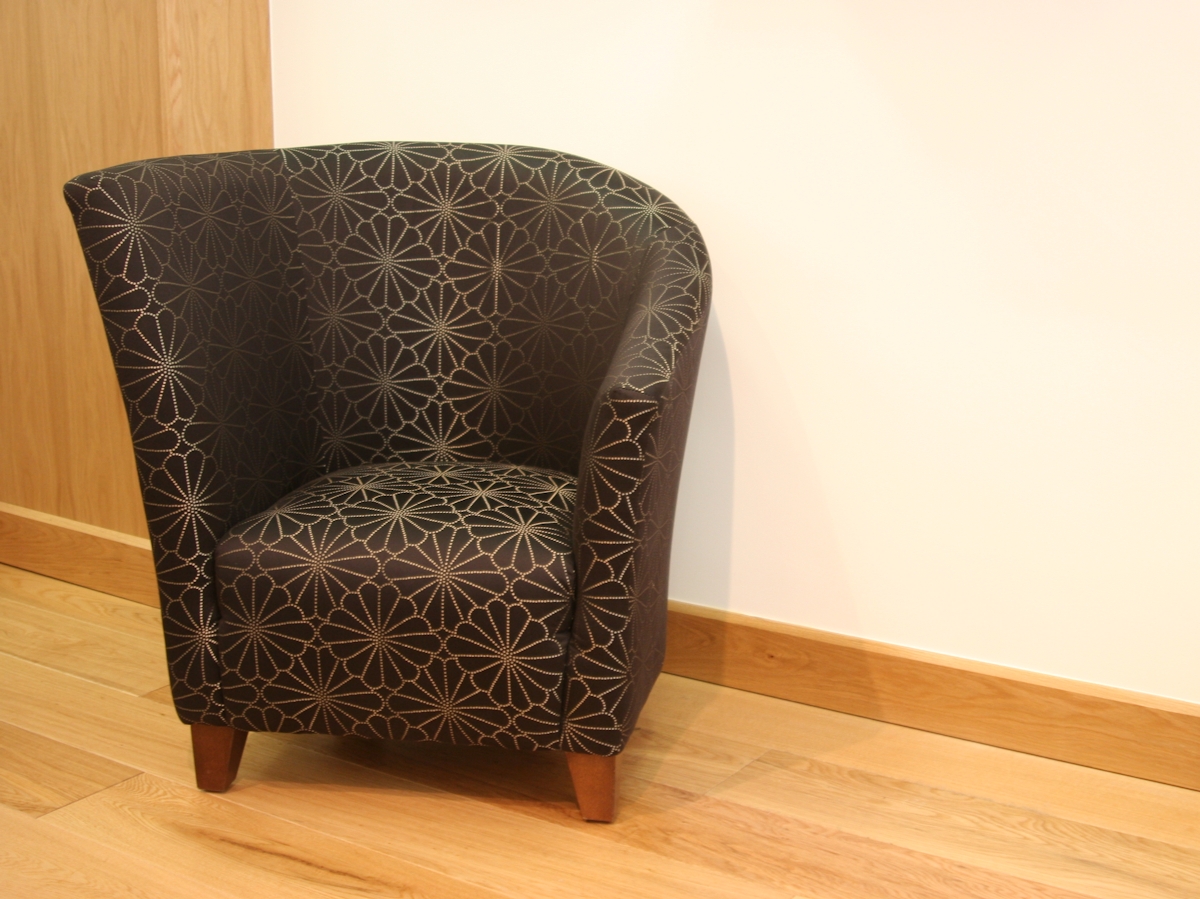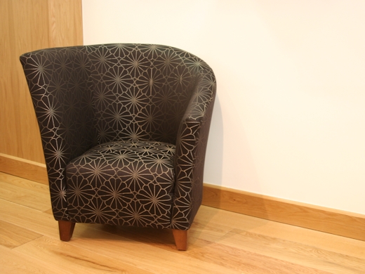 Sublimely fabulous asymmetrical tub chair with wooden feet. Features sweeping arm design. Shown in fabric with a large selection of contemporary textiles and colours available.
